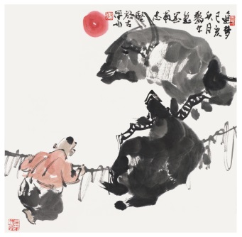 国画《牧牛伙伴亦知音,耕地芬芳踏蹄沉》(雪马收藏)