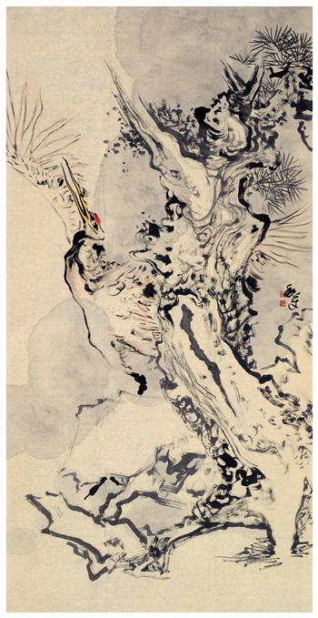 国画《鹤舞松下,引颈高歌》(雪马收藏)