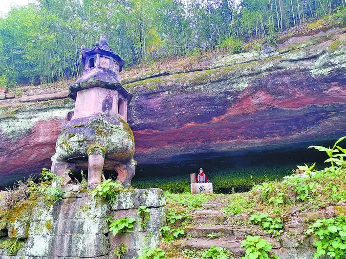 美丽的深山中,翠绿的竹林下,犹如眉月的草衣岩历经千年沧桑,依旧保存着当年的容貌,岩下石桌上还摆放着一尊观世音菩萨像,是近年香客置办的。岩前矗立的大石香炉上长满了青苔和杂草,仿佛在诉说着它的古老与传奇。“香炉上字迹依稀可见为清嘉庆年间立,炉顶四面雕有八仙过海图案,炉壁雕有钱币纹饰等图案,为四足狮头鼎香炉,精美大方。”松柏村支委委员李金钢说,这是草衣寺厚重历史的最好佐证,那些神秘古老的记忆将永久传留。