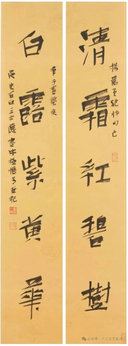 一个大书家的书风演变一定是有其不断实践探索轨迹的。想找些刘一闻早期书法,来看看他如今这种面貌是如何演变过来的,由于手头资料短缺,便在网络上搜索了一下,没有什么特别发现。有少量几幅以简书笔意写篆书的对联,但找不到任何与目前“刘一闻体”之间的联系或轨迹,这样的作品如不是出自刘一闻之手,大概率会被人当垃圾处理。于此,我更愿意相信“刘一闻体”是臆造出来的,是刻意“设计”出来的。