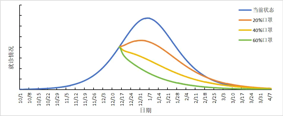 通过模型预测,若人群口罩佩戴率分别提升至20%、40%、60%,就诊人数可能减少23.2%、49.8%、71.1%。