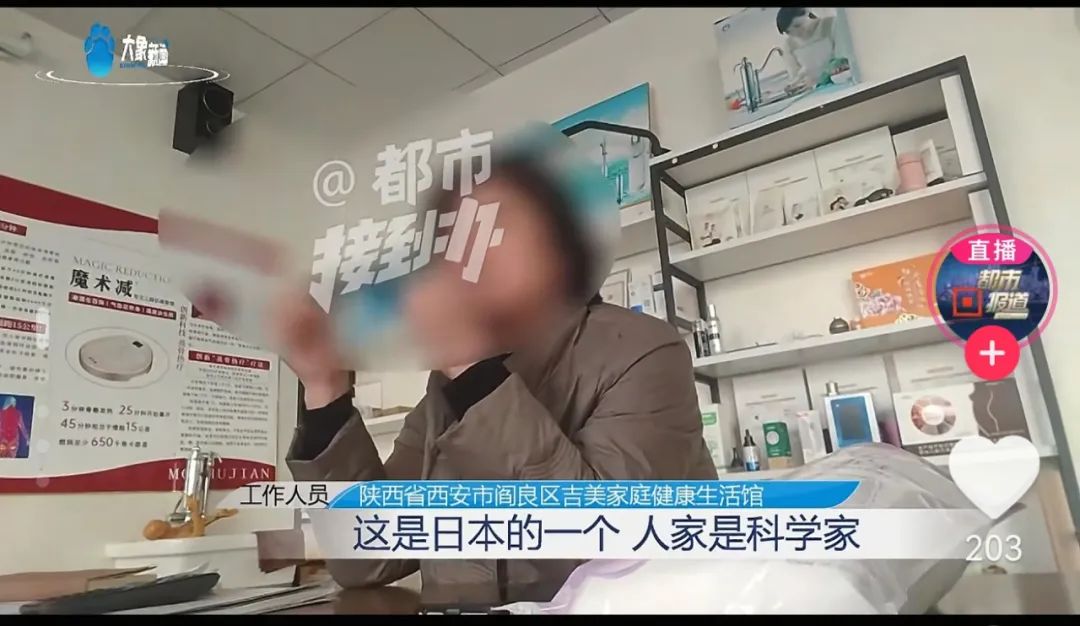 据河南广播电视台报道,陕西陈女士投诉称,61岁的婆婆因病去世后,她整理遗物时发现婆婆生前竟花10多万买各种“神器”,其中有4000元的水龙头、15000元的床垫、300元的眼罩、500元的内裤……这些产品都指向一家叫“吉美”的公司,老人生前甚至因为深信这些产品对外宣传的特殊功效,放弃了吃药。记者经过暗访发现,事情远不止陈女士反映得这么简单。养生馆里宣传小分子水泡脚能治糖尿病,“吉美”工作人员自曝靠拉人头日入1万5,“神水”和“神器”缔造了一个个离谱的“奇迹”,一群人打着养生和保健的旗号,正在掏空老年人的养老钱。