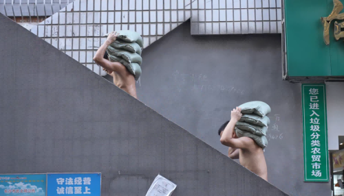 来到现场的小叶没有多言,把自己衣服脱掉后,他把一块大毛巾铺在了背上,随后让同伴把沙子一包又一包地放置在自己的背上,约放置了五包后,小叶开始了自己的搬运。只见他手向后伸,扶稳货物后,有条不紊地一节楼梯一节楼梯往上爬。完成一趟搬运后,豆大的汗珠已经出现在了他的脸上与身体上。