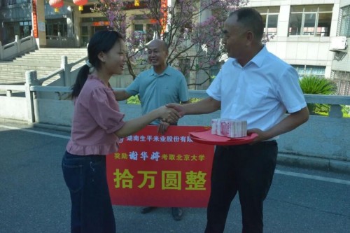 近日,在安仁县第一中学,在今年高考中以优异成绩考入北京大学的学子谢华婷,从生平米业创始人何清平、何平手中接过了10万元爱心奖学金。现场百余名师生代表与县领导共同见证了这一感人时刻。