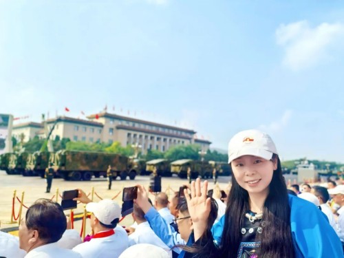 身着民族特色风格服饰的张薇,清晨6点就到达了天安门广场,在观礼台前留下了灿烂的笑容。