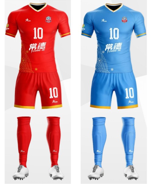 常德队队服整体以湖蓝色为基底,将桃花源的山水灵韵与诗意深融其中,于动静之间传递常德自然灵韵与不懈追求的运动精神。