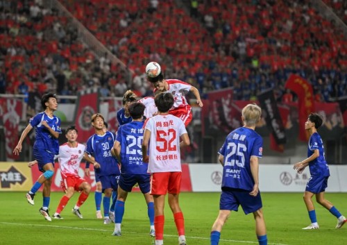 到了下半场,长沙队的体能、技战术、人才优势则进一步凸显。第59分钟,11号球员李章毓接队友24号杨柯从左路开出的角球,高高跃起用一记头槌拿下湘超首粒进球。