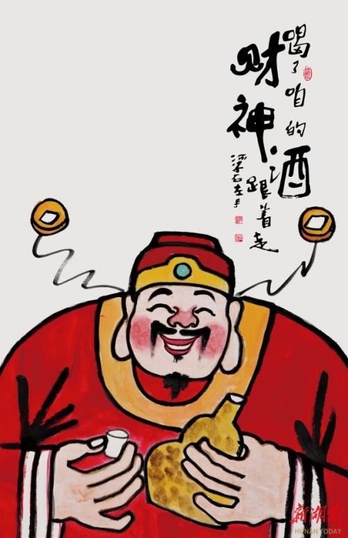 我画的第一幅财神,是为自己的“浮石青瓷”酒做广告,题款是“喝了咱的酒,财神跟着走”。这款酒在疫情前销得非常好。最重要的是,它让我与著名企业家与慈善家姚社初先生结上了书画之缘。姚社初先生是国内个人收藏黄永玉先生作品最多的人。他慧眼识珠,认为我的画风与黄永玉先生的画风颇为相似,都是变形的漫画人物,都是原创的题款,都有着“不规矩、不正经”的调性。但两者又有所不同。黄老更古灵精怪,更自由挥洒,他的幽默是开门见山而又锋芒毕露的,讥讽起人性的弱点来一点也不客气。我的画则偏重于用大白话讲哲思悟禅意,属于曲里拐弯的闷骚型冷幽默,或正而八经地胡扯,或东拉西扯地念正经。姚社初先生是懂黄永玉的,也是懂我的。他是黄永玉的粉丝,是我的贵人。他对我的“浮石绘话”千万级别的一期投资,对我是雪中送炭,让我终于从第三次创业的灭顶之灾中活了过来,爬了出来。