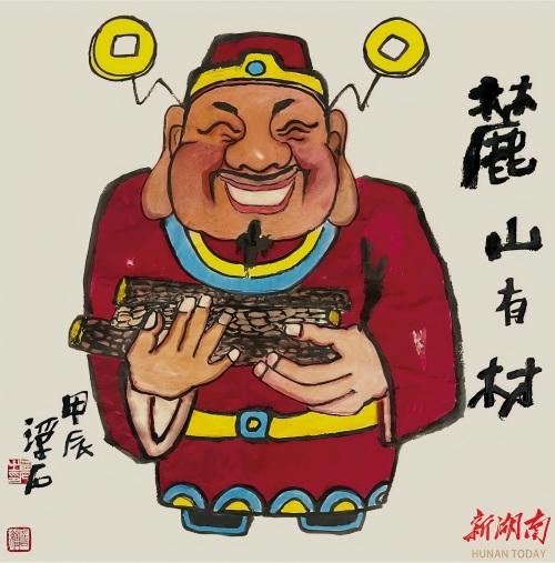 我的第二幅财神画于2024年年初,是专门为岳麓山画的,叫“麓山有材”。当时我们公司刚刚准备入驻岳麓山,就遇到了让山上的林木折损率超过百分之九十的冰雪灾害。每天上山,见到古木新树被剃头腰斩,断枝堆满每一条大路小道的两边,真是心痛不已。我思索良久,画了一幅“麓山有材”的财神。双手捧着几支断枝,脸上堆满亲切而快乐的笑容。我以这尊财神为岳麓山祈福,希望它早日恢复林木葱郁的勃勃生机。同时也是为了与山脚下的千年书院一一岳麓书院相呼应。“唯楚有材”“麓山有材”,祝愿岳麓山大学城人才辈出,文化与科技兴湘兴国。还有,就是祝愿已经是文化富山的岳麓山,成为物质财富的福地。后来,这幅“麓山有材”被岳麓山风景名胜管理处制做成道旗,笑迎每年数千万游客,带给他们美好的祝愿与憧憬。而我们公司据此开发的各类“麓山有材”的文创产品,也理所当然地成为了广大游客争购的爆款。