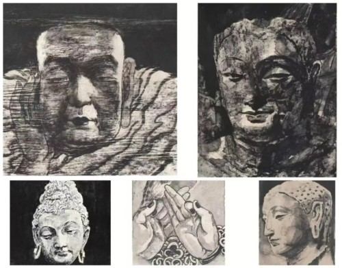 邹建平近些年游历在中国西部大大小小的洞窟之中,在他的艺术世界里,传统佛教美术的造像构成了一个独特的精神维度。这并非对宗教符号的简单再现,而是一场以艺术为媒介的专注行动——一种西蒙娜·薇依所定义的视觉“祈祷”。艺术家以近乎“沉潜”的状态投入创作,将每一次运笔、每一层渲染都转换为修行的仪轨。在这个充满仪式感的过程中,水墨的晕染与凝固、材料的碰撞与融合,都超越了单纯技法的范畴,成为精神修炼的可见痕迹。艺术家并非复刻顶礼膜拜的圣像,而是借其庄严静谧的形式,在创作的神圣时刻里,将外在的宗教图示转化为内在的精神实践,为当代漂泊的心灵提供一处可栖息的“精神锚点”。