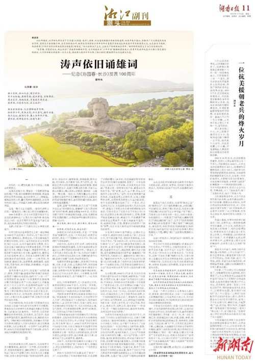 就是这个诗人毛泽东,他曾用“指点江山”的“激扬文字”,在古老的潇湘大地,点燃《湘江评论》的红焰,照亮了湘江的夜空。他在亲自撰写的《湘江评论》创刊宣言中写道:“至于湘江,乃地球上东半球东方的一条江。他的水很清,他的流很长……时机到了!世界的大潮卷得更急了!洞庭湖的闸门动了,且开了!浩浩荡荡的新思潮业已奔腾澎湃于湘江两岸了!顺他的生,逆他的死。如何承受他?如何传播他?如何研究他?如何施行他?这是我们全体湘人最切最要的大问题,即是‘湘江’出世最切最要的大任务。”