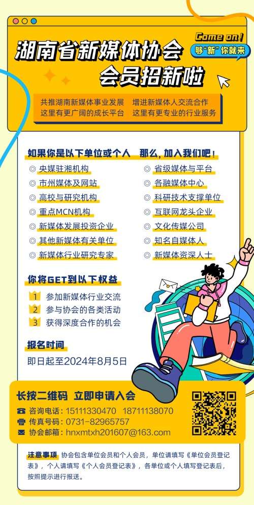 为搭建起新媒体运营者交流合作、持续发展的良好平台,广泛凝聚新媒体力量,充分发挥省新媒体协会在桥梁纽带、行业自律等方面的作用,扩大协会影响力,推进网络文明建设,现邀请从事新媒体运营和研究,以及内容生产创作的企事业单位和个人加入湖南省新媒体协会。现就新一轮会员招募事项说明如下: