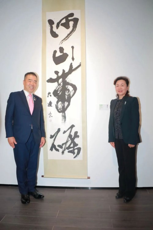 肖百灵在致辞中回顾了湖南与滋贺因“洞庭湖与琵琶湖对话”结缘40年的合作历程,特别提及三日月大造题写的“河山带砺”(寓意中日友谊如山河永固)与中国书协副主席鄢福初“翰逸神飞”题字的东方美学共鸣。她强调:“展览既是对历史的致敬,更是面向未来的文化对话。”