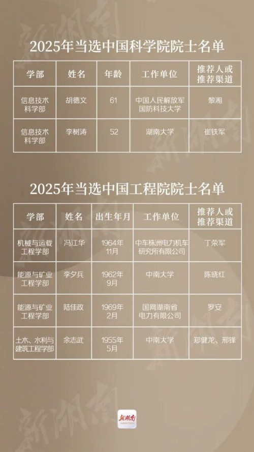 其中,中国人民解放军国防科技大学胡德文、湖南大学李树涛当选中国科学院院士。