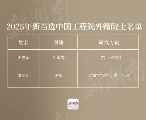 此外,湖南大学土木工程学院教授、博士研究生导师史才军,岳麓山实验室研究员、湖南农业大学兼职教授、湖南文理学院合成生物产业学院名誉院长张友明当选中国工程院外籍院士。