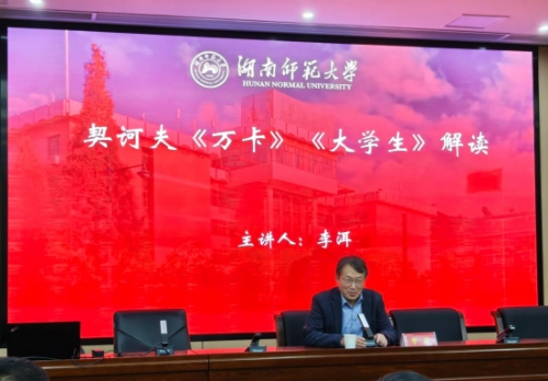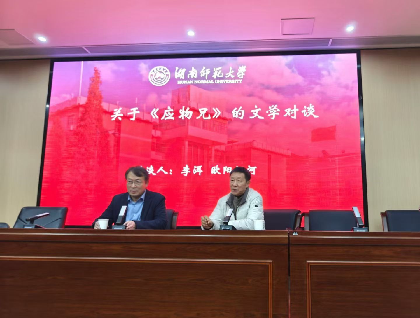 11月19日晚,著名作家李洱和欧阳江河联袂登台文学院“智慧之光”名师大讲堂,在216报告厅开展题为“契诃夫《万卡》《大学生》解读”和“当代性视野下的《应物兄》写作”的讲座和对谈活动。湖南师大文学院副院长岳凯华教授主持,湖南省作协副主席马笑泉,诗人、湖南名人网总编辑雪马及湖南师大文学院副教授李作霖,还有许永宁、李婕、陈展等教师现场参会。
