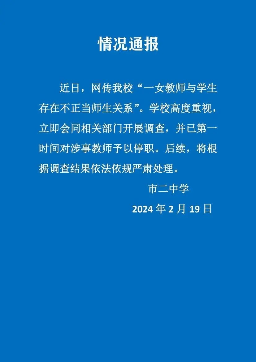 近日,网传我校“一女教师与学生存在不正当师生关系”。学校高度重视,立即会同相关部门开展调查,并已第一时间对涉事教师予以停职。后续,将根据调查结果依法依规严肃处理。
