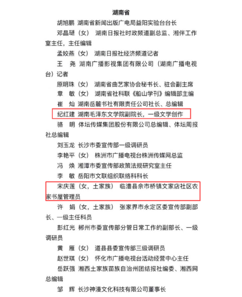 湖南作家纪红建、宋庆莲拟获全国表彰