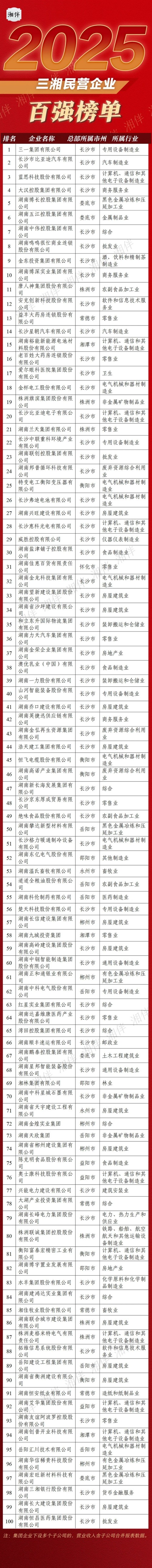 今年4月开始,湖南省工商联对全省2024年度营业收入超过5亿元的上规模民营企业进行调研,以年营业收入为主要参考指标,经审核审议后最终形成2025三湘民营企业百强正式榜单。