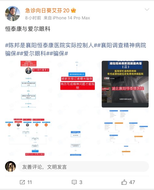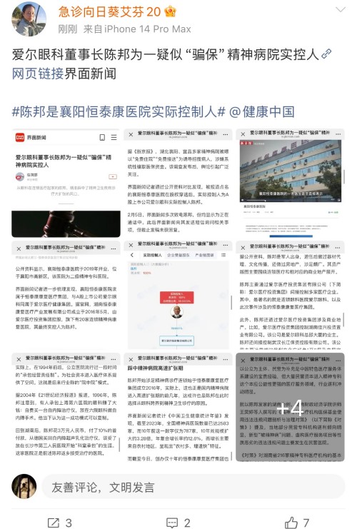 2月5日,知名急诊医生艾芬公开投诉,爱尔眼科的创始人陈邦与涉嫌骗保的精神病医院有股权关联。
