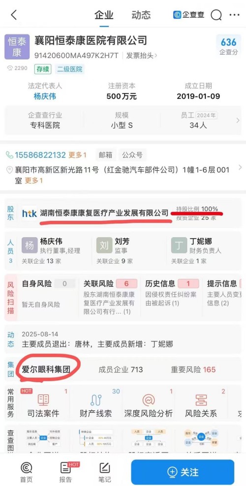 天眼查显示,襄阳恒泰康医院有限公司成立于2019年1月9日,工商信息显示,经营范围为“精神科、预防保健科、医学检验科、医学影像科”。由湖南恒泰康康复医疗产业发展有限公司100%持股。