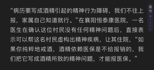 据了解,该医院医生曾在确认一名就诊者没有任何精神问题后,直接表示可以帮这名就诊者虚构出精神疾病,让其住院,“病历要写成酒精引起的精神行为障碍,我们不往上报,家属自己知道就行。”“如果你纯粹地戒酒,酒精依赖医保是不给报销的,我们把它写成酒精所致的精神问题,才能报医保。”
