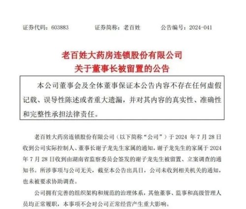 另据此前报道,2024年7月30日,老百姓大药房连锁股份有限公司(老百姓,603883.SH)公告,公司于7月28日收到公司实际控制人、董事长谢子龙家属的通知,谢子龙的家属于7月28日收到由湖南省监察委员会签发的谢子龙被留置、立案调查的通知书。所涉事项与公司无关,截至本公告出具日,公司未收到相关机关的通知,也未被要求协助调查。公司其他董事、监事和高级管理人员均正常履职,本事项不会对公司正常经营产生重大影响。