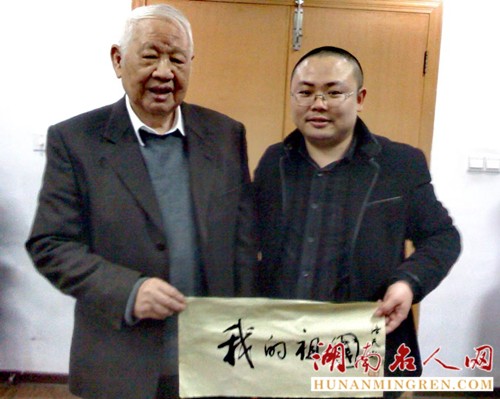 第一次“面见”,是在郴州,2007年10月9日。洛夫先生应诗人欧阳白之邀,到郴州讲学游玩,而我当时也到访郴州。俗话说,来得早不如来得巧,缘份就是这么奇妙,我得以拜见洛夫先生。在郴州市工商局大礼堂里,我和郴州本地诗人们,一起作为嘉宾,还有其他热爱诗歌的人们,在台下聆听了洛夫先生博学而精彩的诗歌讲座。讲座之后,在诗人欧阳白的办公室里,正好有一个书法台。我早就听闻洛夫先生的书法了得,故斗胆请他为我的诗歌《我的祖国》题写篇名。洛夫先生欣然应允,他用毛笔,一挥而就。写好后我与他合影留念,当时真是既感动又感激。