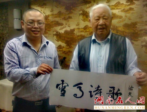 洛夫先生走了,世上再无“诗魔”,但“诗魔”的诗歌,会长留人间。每次端详合影照,洛夫先生慈祥的笑容、诗歌的意象及睿智的诗观,便会涌现出来击中我的心灵,使我的怀念无限缠绵。作为一个湘籍后辈诗人,我能有缘两次得见“诗魔”洛夫,并能有幸两次获赠他的亲书墨宝,三生有幸,当为激励,向诗而生,缅怀先生。
